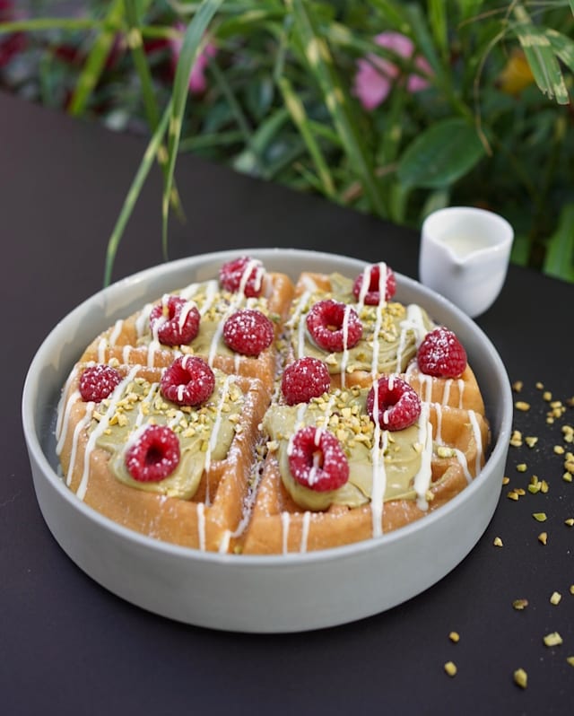Waffle con lamponi freschi, crema di pistacchio e granella di pistacchio