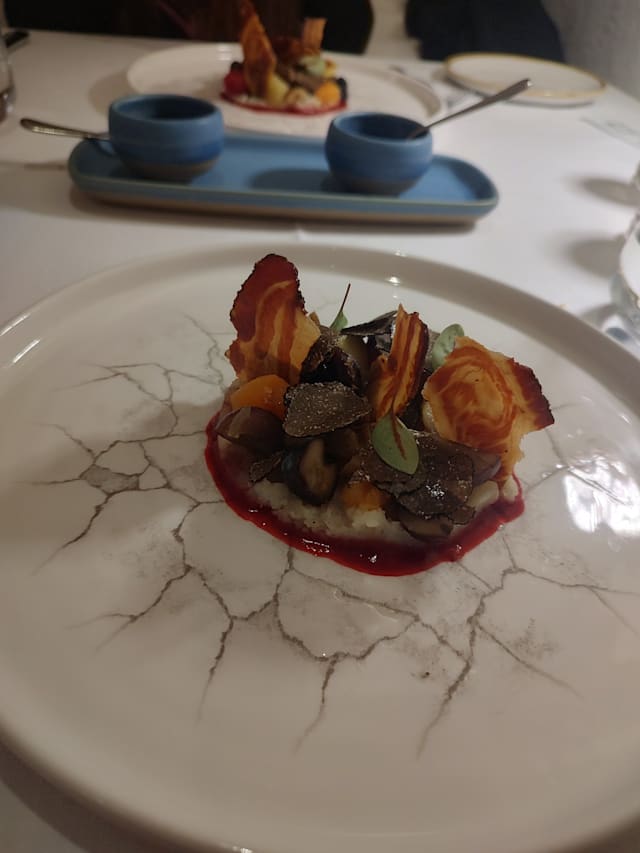- Con millefoglie di patate con riduzione all'aceto invecchiato e cenere alle erbe