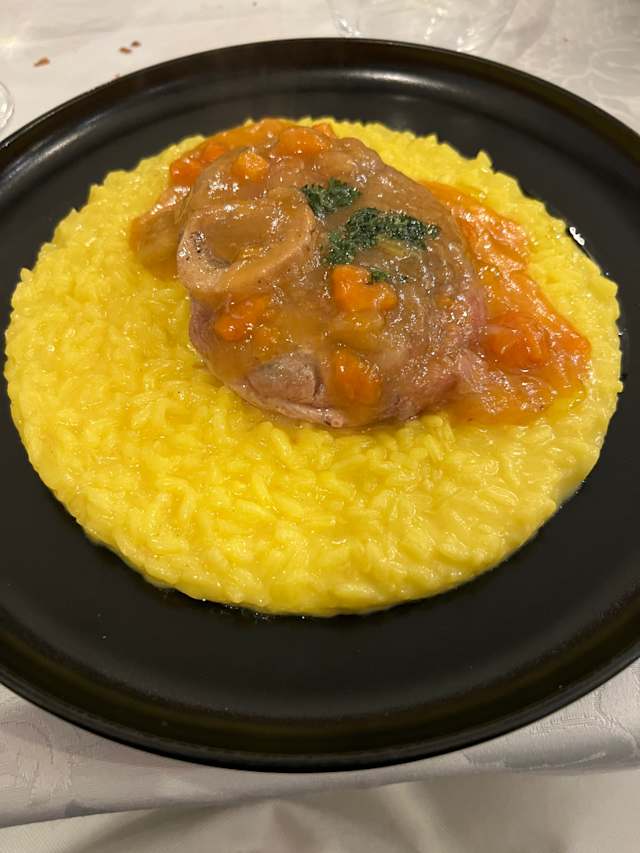 Osso buco di vitello in umido, con cipolle, carote e sedano. Servito con risotto giallo e gremolada (salsa a base di aglio, olio, prezzemolo e limone.)