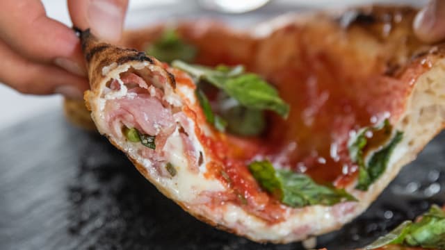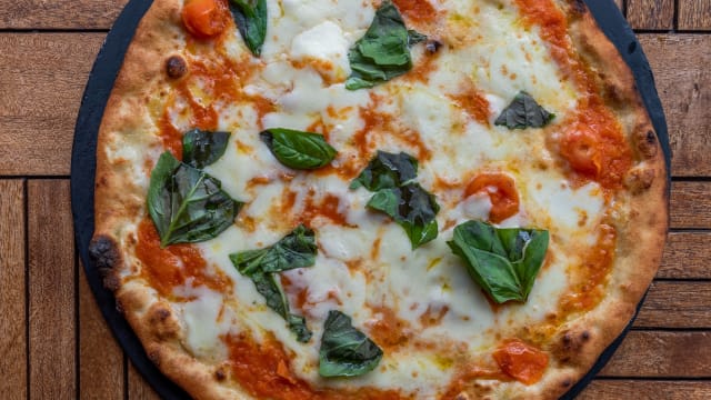Fior di latte campano, prosciutto crudo casa graziano (24 mesi), rucola, scaglie di grana riserva oltre 20 mesi, pomodorino del piennolo del vesuvio dop e olio evo