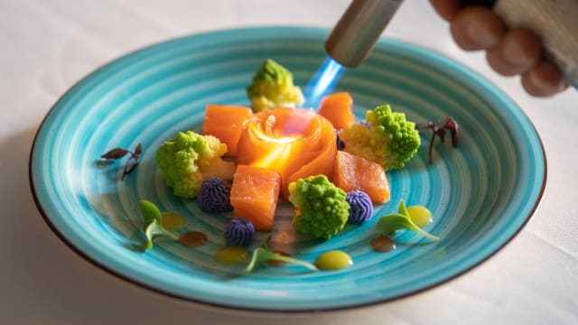 Salmone agli agrumi, salicornia al vapore, emulsione al melograno