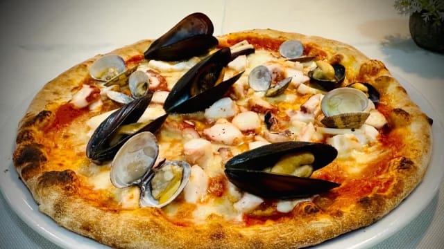 Pomodoro, fiordilatte, funghi champignons guanciale, gamberi e bottarga