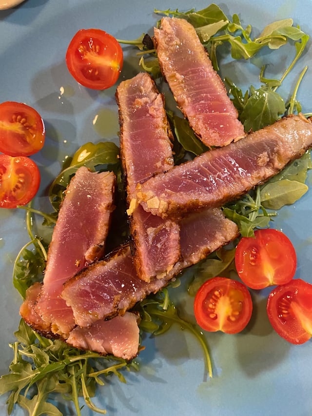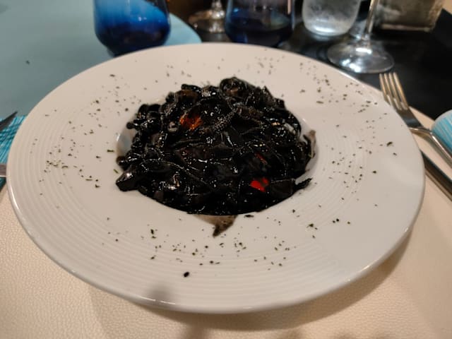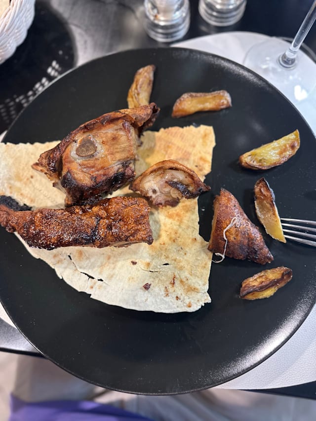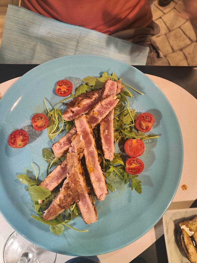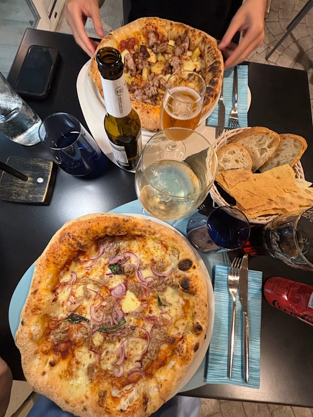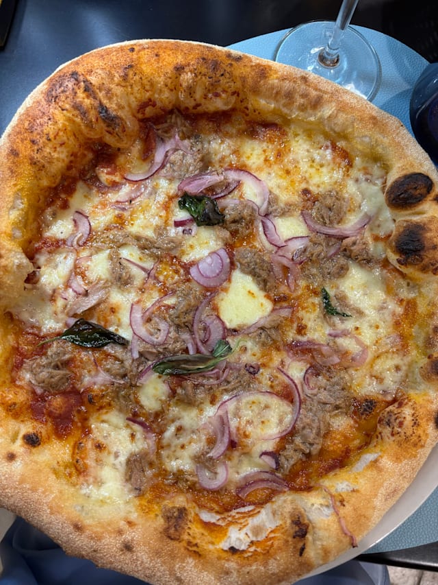 7.5/10One waitperson for about twelve tables, so service a bit slow. Pizza arrived first and was not hot…crust pre-cooked? Outdoor terrace of tables right next to street so smell of exhaust wafted in. Located up the hill but no “view” as restos’ hotel building directly across the street was blocking.