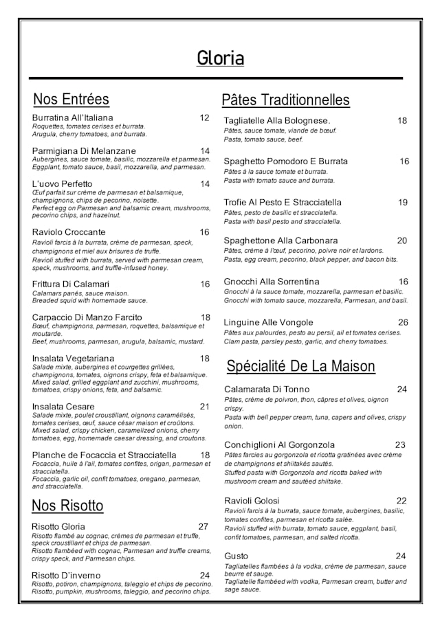9/10My husband and I enjoyed our meal here. The margherita pizza and service were excellent. We would recommend Gloria's to anyone wanting a warm dining experience with quality food and thoughtful service.