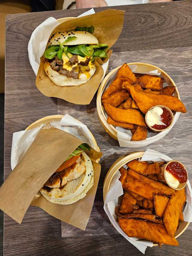 - Boeuf angus, cheddar, salade, cornichon, tomate, oignon rouge, mayo citron, sauce chilli mayo