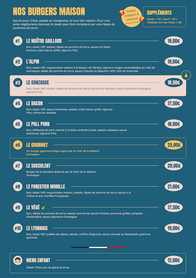 Hi Bruno, Thank you very much for visiting us and taking the time to leave us a review! We look forward to welcoming you back! The Gonzague Burgers team