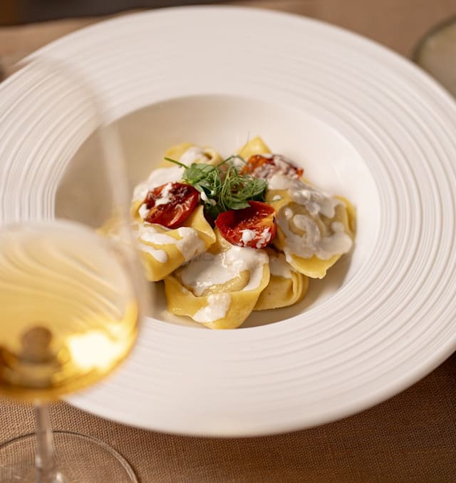 Tortelloni di ragù mangalico, pomodoro confit e provolone di formia