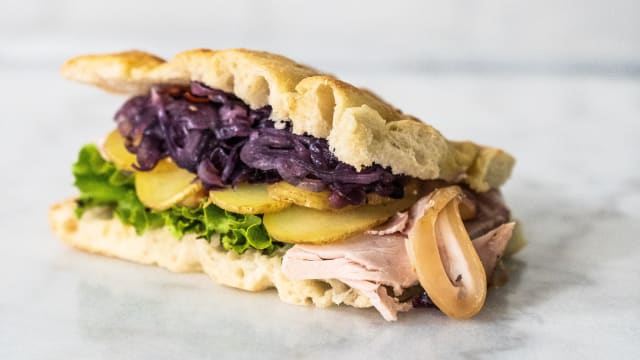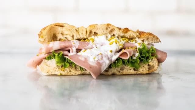 1 etto di prosciutto cotto di norcia, crema di burrata, mozzarella di bufala, lattughino, pomodori cuore di bue, pesto di pistacchi e granella di pistacchi.
