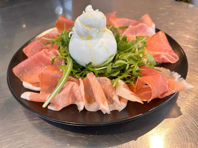- (Tartare di gamberi rossi, stracciatella, lime, crema di menta, olio evo)