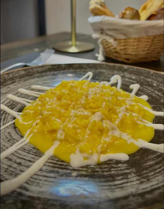 - (Riso carnaroli, zafferano, taleggio, foglie d'oro)