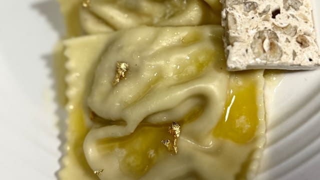 Tortello ripieno di di ricotta e ciliegie condito con il burro di alpeggio.