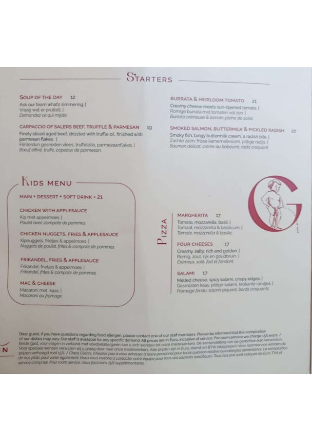 2.5/10Good not good and no variety as on the fork sample menu. Very upset. Even hamburgers were very bad, meat not good, probably mixed with something else. My kids took hamburgers. We were advised to take the only local plate on the menu, carbonate Flemish. We take 2 of them. We were disappointed. We only wanted chicken, as was stated on the fork menu or a regular hamburger at least.