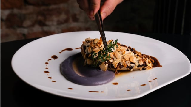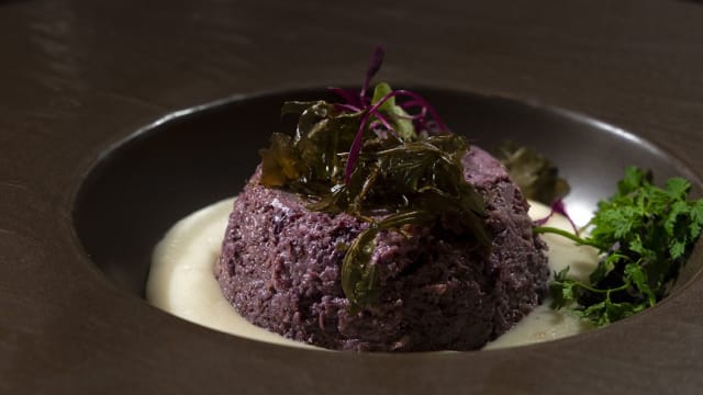 In crosta di zucchine, cotto a cottura lenta, servito su crema di barbabietola e olio alla menta