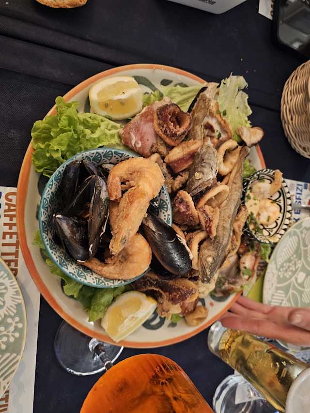 - (Seppia*, gamberetti*, tentacoli di totano*, cozze, polipo,* olive, pomodorini freschi, sedano e finocchio)