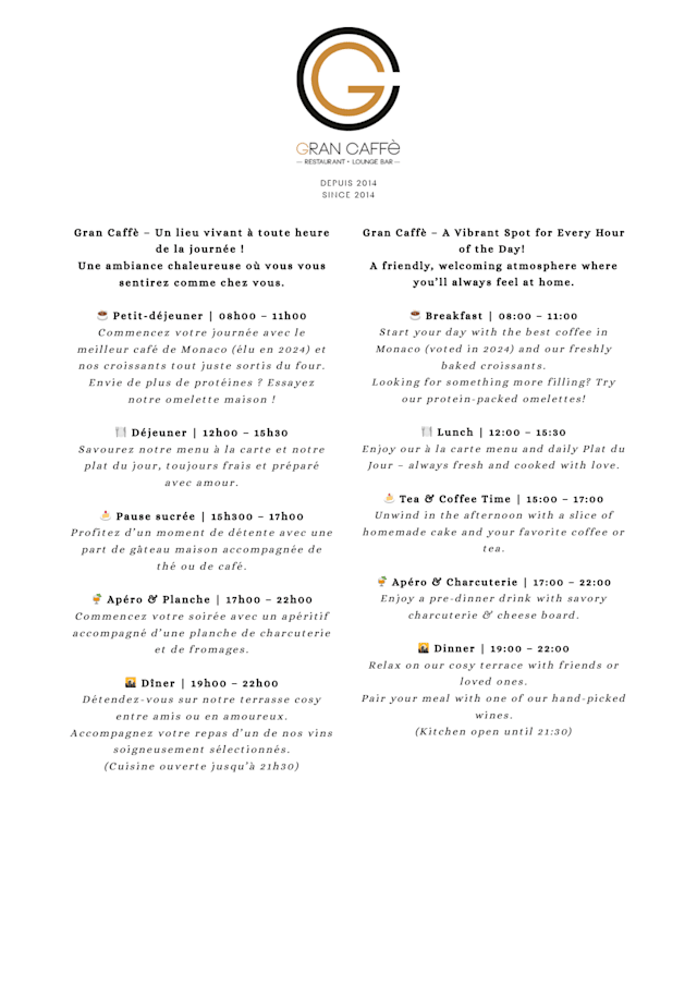 10/10I recently had the opportunity to eat at Gran Caffe restaurant in Monaco and was impressed by the quality and flavor of the dishes! The fish was fresh and flavorful, prepared to perfection. But the highlight of the night was the Trofie Pesto - simply delicious! The combination of flavors was perfect and the service was excellent. I highly recommend this restaurant to anyone looking for a high-quality experience in Monaco. The staff is very friendly. I'll definitely be back!