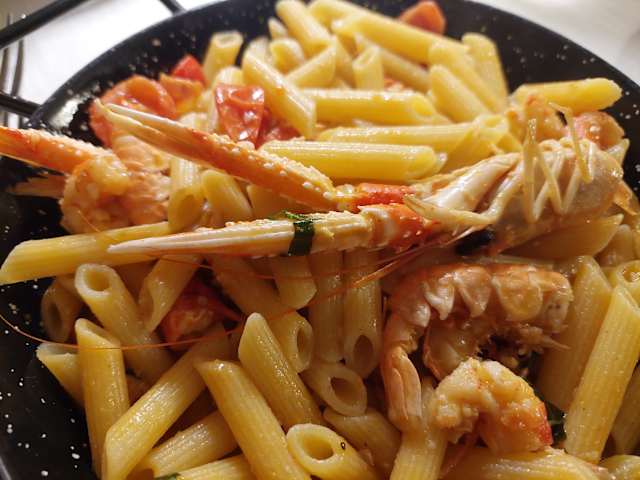 - Cozze, vongole, calamari, scampi, gamberi e cicale con pomodoro fresco)