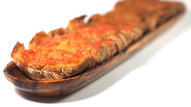 Zamburiñas con pisto de verduras, mayonesa de azafrán y crujiente de pan de ajada de pimentón (unidad)