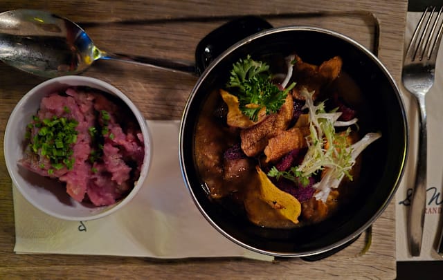 9/10A pleasant restaurant with good, prompt service. We started with the bread and dips and they were very nice. The two small loaves looked as if they could be tough but they were surprisingly soft and tasty and the dips were mild flavoured and tasty. The olives were good. I had Frisian stew and my wife had fish and chips. The stew was tasty and I couldn’t work out whether the red cabbage was mixed in with the stew or the mashed potato but it was tasty. It also came with a separate dish of cold apple sauce which was odd but was tasty and we both ate it as it was a refreshing alternative, especially the salty fish. The fish dish was too big to consume and it came with an extra dish of pleasant chips which we picked at. We were too full to consider dessert and only had a large bottle of cold water to help wash it down. Beware, there is a camera taking pictures of cars entering the street where there are road works going on. We may have got a ticket for entering. There is a garage nearby..