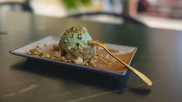 Pastel libanés elaborado con hojaldre, nueces y miel servidas con helado de vainilla.
