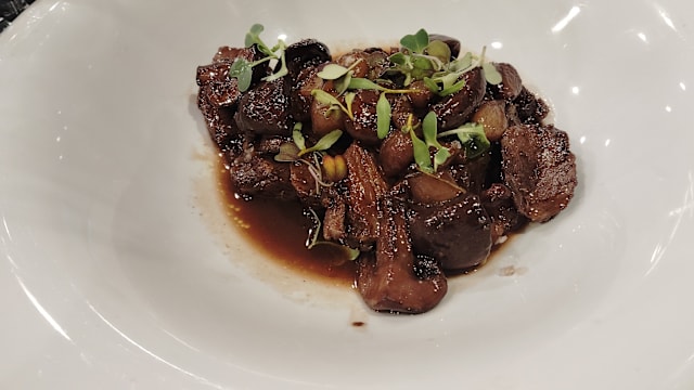 7/10Burger was a little undercooked for my liking, but I guess medium might mean something different here, it was very pink! We were on the roof, and heavy rain spoilt the ambiance, as the coverings could not cope with the water, outside their control but I can only rate on my experience. We moved downstairs, and they recooked the burger and gave additional chips. Can't fault the staff.