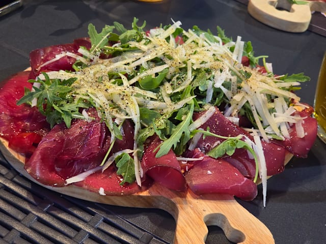 Bresaola punta d’anca, mozzarella fiordilatte, pomodorini, rucola, grana padano