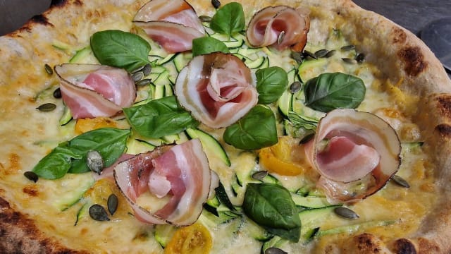 Prosciutto crudo, mozzarella fiordilatte, pomodorini, rucola, grana padano