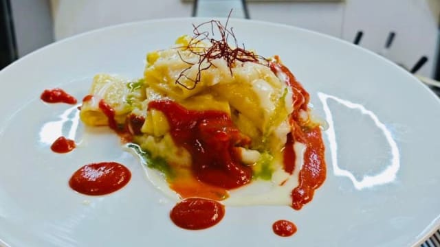 Raviolo di pasta fresca ripieno di ricotta, essenza di pomodoro, battuta di fassona e crema di basilico