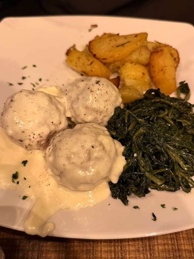 - Polpette cacio e pepe con cicoria ripassata (aglio, peperoncino) e patate al forno