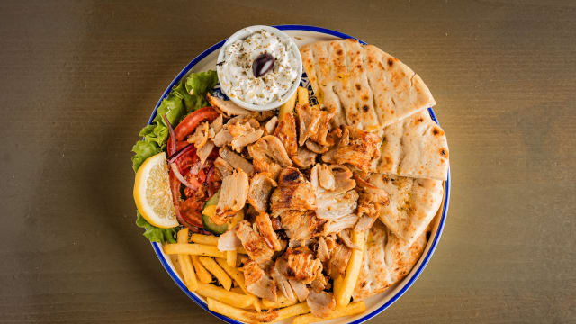 Tipico piatto di carne di pollo, servito con patate fritte, pita artigianale, pomodoro, cipolla, cetrioli, lattuga gentile e salsa tzatziki