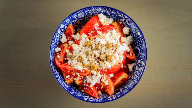 Con pomodoro, cetrioli, formaggio feta dop, olive di kalamata, peperoni, cipolle, olio extra vergine d’oliva servita con pita artigianale