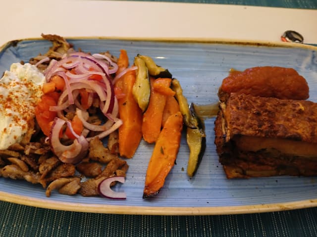 7/10We ate here with 30% discount last night. The food was delivered quickly and very fresh and delicious. We had the sharing dips and mezze for 2 but split between 4 people with pitta breads each and a Greek salad. All great! Then shared a veggie moussaka, stuffed pepper and pork gyros. There was plenty. But considering we were the first people in the restaurant at 8pm, it took about 20 minutes to get a drink when we ordered bottles of beer that you open yourself. There was also no music for an hour or so, therefore extremely quiet with not atmosphere. However would go back for the food