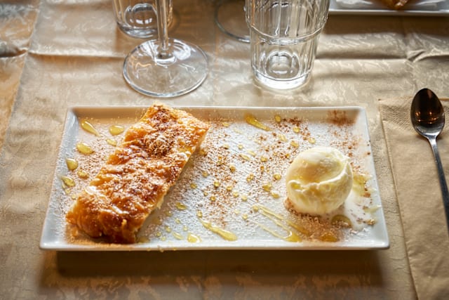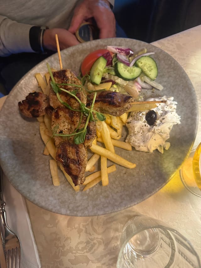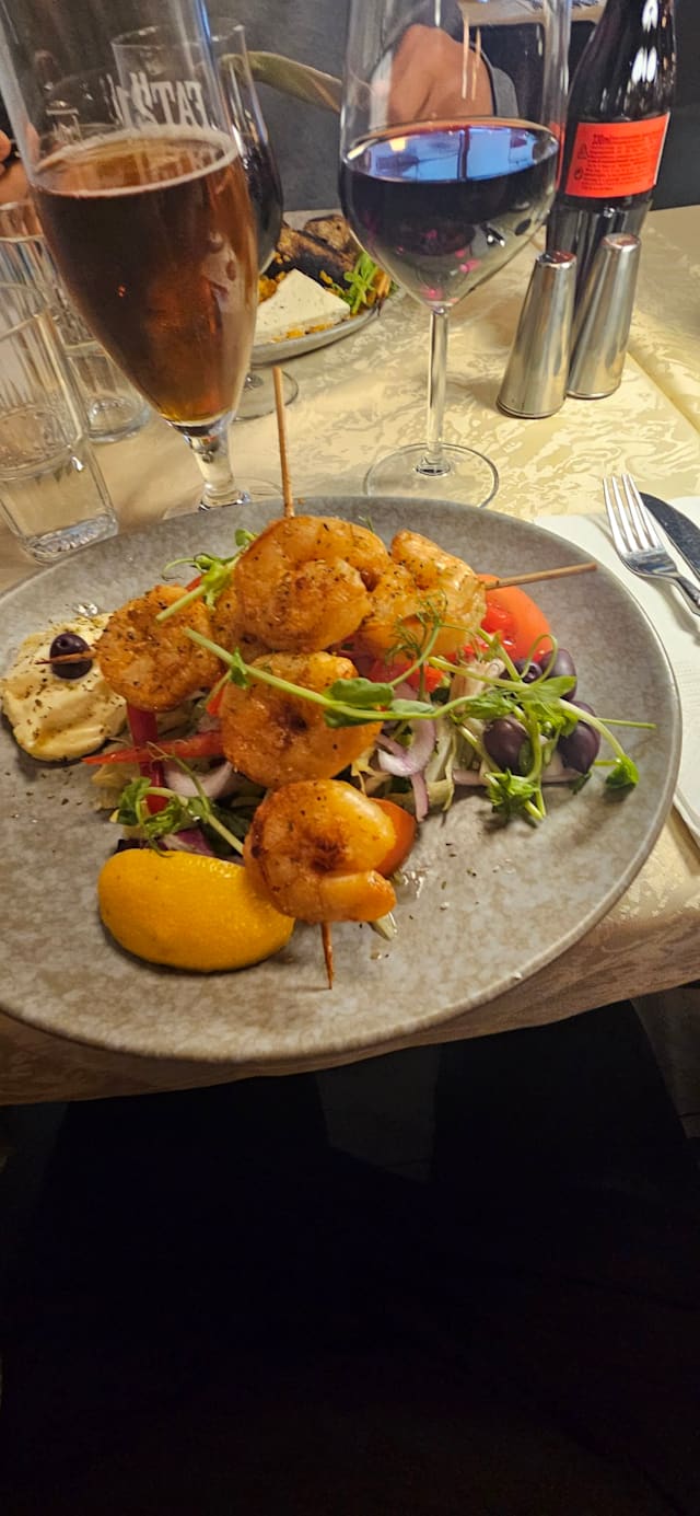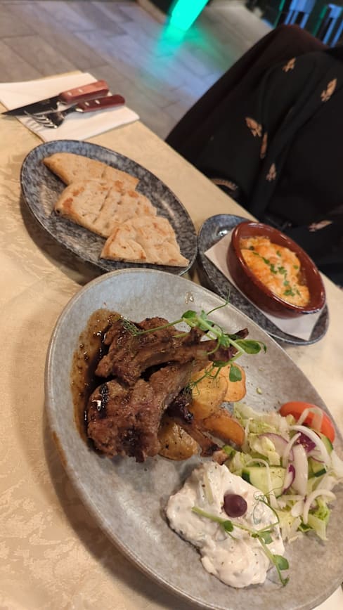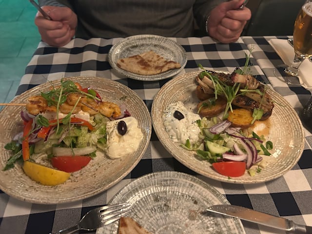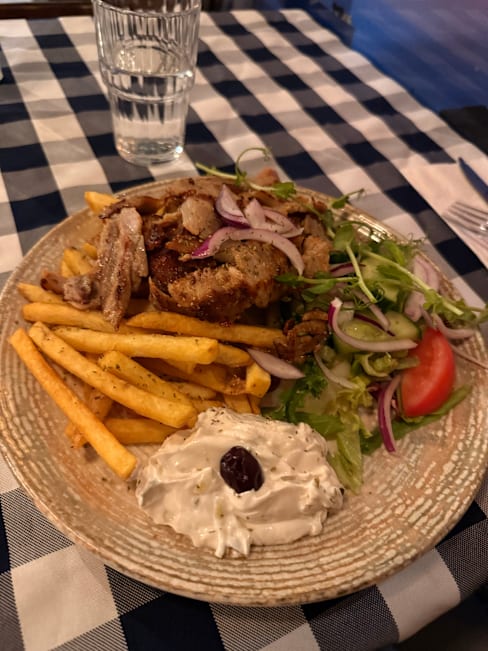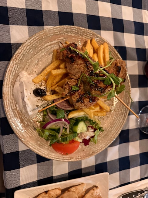 6.5/10Went with wife and son 6 years old. My wife didn't enjoy much. Actually the food was average this time, steak was good but served with bernaise and wine sause (not very Greek), slow service, nothing to keep the kid busy (like a simple sheet of paper and crayons), tzatziki tasted odd, like it had some chemicals, sorry.