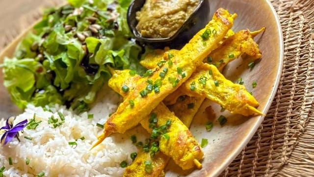 Espetadas de frango, confecionadas em leite de côco, cúrcuma e molho indonésio satay acompanhadas por arroz basmati e salada composta por mistura de alfaces e sementes de girassol