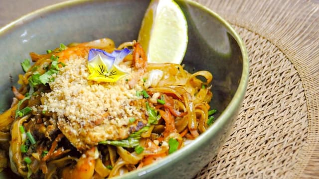 Massa de arroz tailandesa, confecionada em molho ostras, soja, tamarindo, ovo, amendoim, cebolinho e coentros, com - camarão