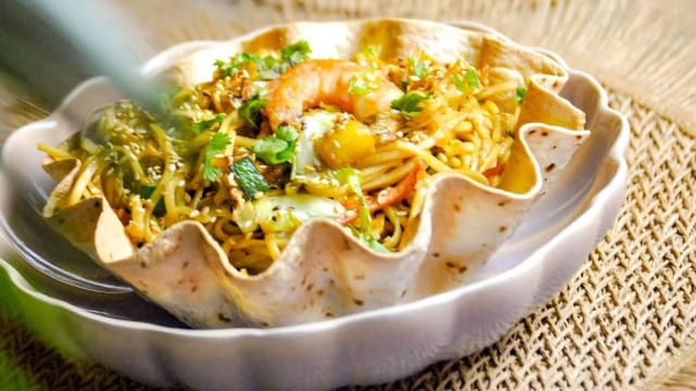 Massa de ovo, com camarão, legumes salteados, ananás, coentros e sementes de sésamo servidos numa concha de massa de trigo