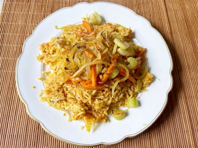 Fragrante riso basmati, servito al modo degli imperatori muguali, aromatizzato, cotto con gamberetti