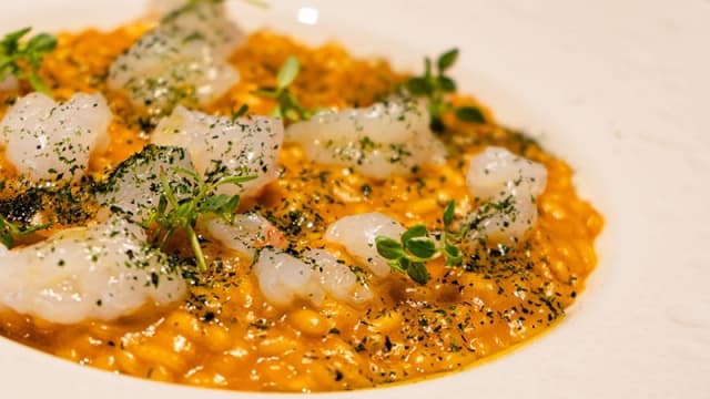 - Risotto intrepido con bisque di scampi di mazara del vallo, polvere di alga di mare, tartare di scampo crudo e olio al prezzemolo