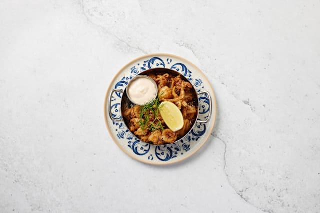 - Lättpanerade bläckfiskar serveras med chiliaioli & grillad citron. Välj mellan ris/ bulgur/ pommes frites/ klyftpotatis/ salladsbädd.