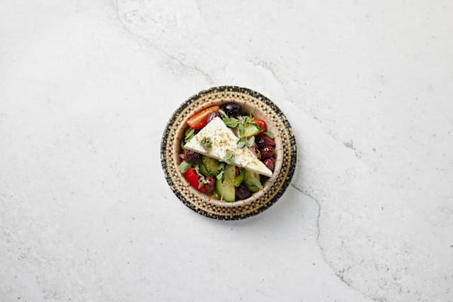 - Grekisk sallad med fetaost & kalamataoliver. Serveras med sallad & bröd. Välj mellan ris/ bulgur/ pommes frites/ klyftpotatis/ salladsbädd (gäller ej halloumi burger & sallader).