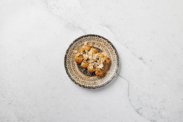 - Friterade fetaostrullar med honung, rostade mandelspån & svart sesam.