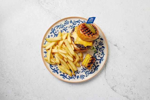 Ca 200g premium burgare med kopanisti, sallad, ölbräserad lök & saganakiost toppad med fikonmarmelad. Serveras med pommes frites & pickles. | serveras med tzatziki. Välj mellan ris, bulgur, pommes frites eller salladsbädd (gäller ej moussaka & stavros burger).
