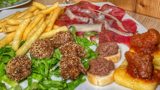Polpettine*, crostini con pate, medaglioni di polenta e ragu, patate fritte, bresaola