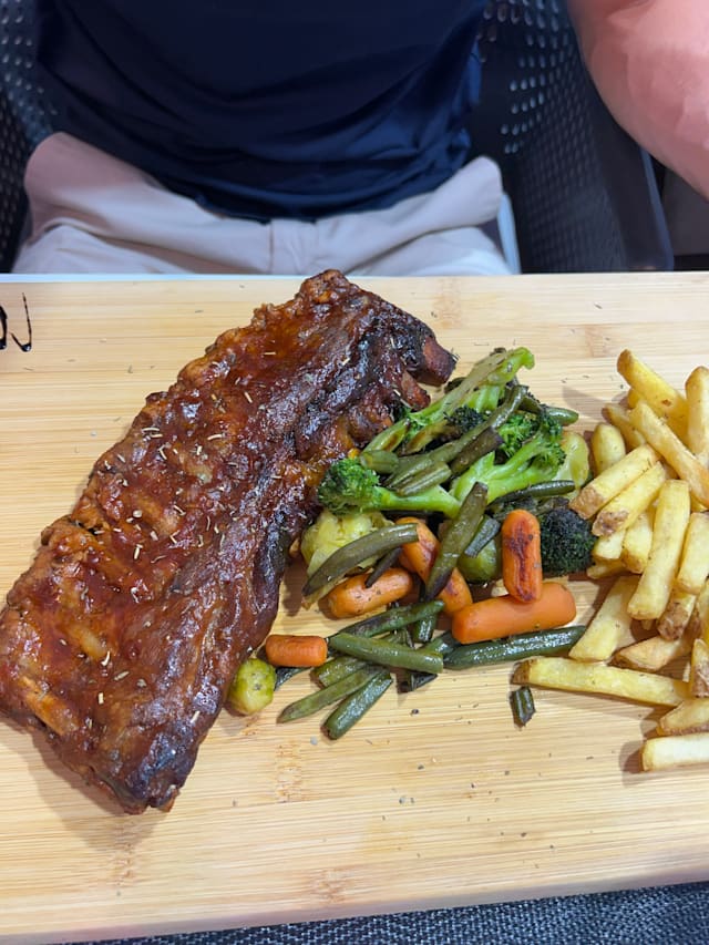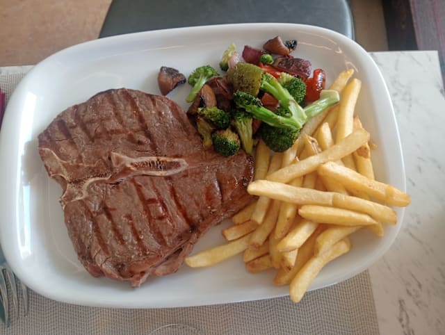 5.5/10The restaurant itself is nice, clean and well presented. It was quite busy when we arrived with an ok atmosphere. The menu is quite large with lots of choice. The wine is spirits are very expensive, more than ‘better’ restaurants on the strip. We both went for steaks as the reviews had been good, a small rib eye and a large fillet steak. The rib eye was a very poor quality piece of meat, definitely under weight and with lots of fatty inedible bits. The fillet was also underweight and overcooked for a medium rare but better than the rib eye in terms of quality. The chips were crispy and plenty of them, the pepper sauce tasted like it was out of a packet but good enough compared to the steak. The waiters were very attentive though and very well intended. We obviously won’t be back, but can only comment on the steak, and could not recommend.