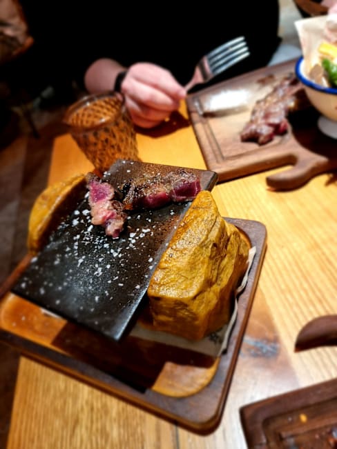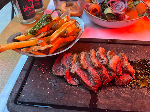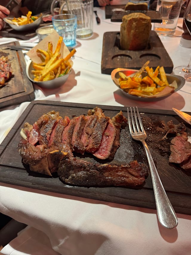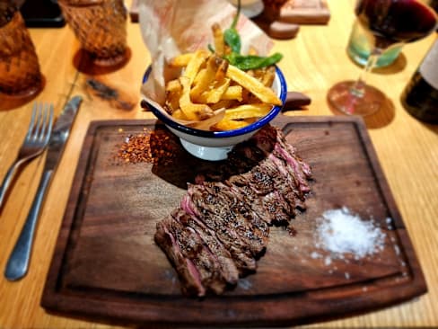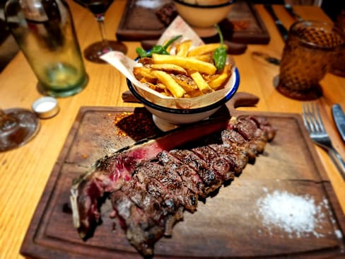 6.5/10+3Good food, we chose the chorizo sausages and tuna tacos to start. Both were very tasty and well presented. For mains we chose the galician steak plus a skirt steaks. Both were good quality cuts on good provenance. Presentation in boards was easy to navigate for large cuts of meat. The additional hot stone to cook the steak more to our liking was a nice touch. Desserts were pleasant. Service was a little slow plus the dining room is quite noisy. The server poured the wine without allowing us to taste. Also there were a number of small flies hanging around the drinks glases which is off-putting. If the above issues were rectified, we would return. The food was excellent, our experience diminished by the other issues highlighted.