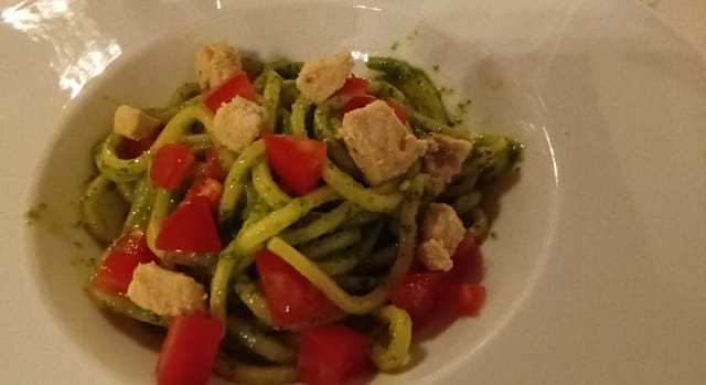 Tonnarelli al pesto di rucola con dadolata di pesce spada e anacardi