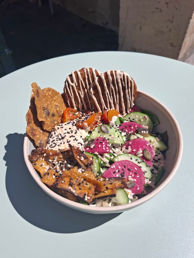 8.5/10A small cafe with a tranquil ambiance on a quiet street. The cashier/server was friendly and provided good information on the cafes menu.