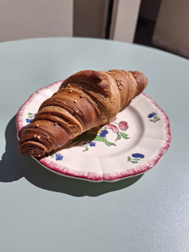 1 croissant épeautre quinoa fourré à la pate choco-noissette maison, banane et noissettes