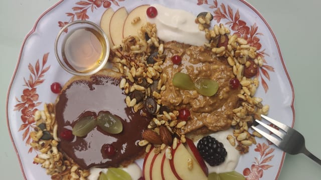 Pancakes sans gluten, yaourt de soja bio, sirop d’érable, fruits frais bio de saison, crispy granola aux graines et topping au choix : choco-noisette ou beurre d’amande ou beurre de cacahuète