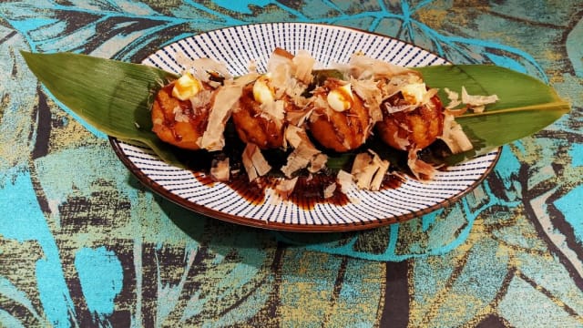 Entrante asiatico con base de harina y relleno de pulpo. Textura esponjosa, muy tierno y sabroso. Acompañado de salsa mayonesa, salsa unagi y katsuobushi (laminas bonito)