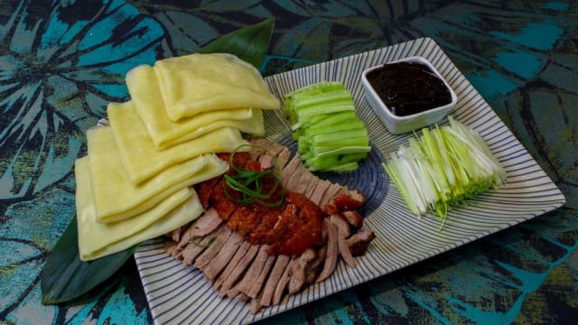 Pato artesanal cortado en laminas y salteado en una salsa elaborada a base de cítricos (ciruela, mandarina deshidrata y tamarindo)